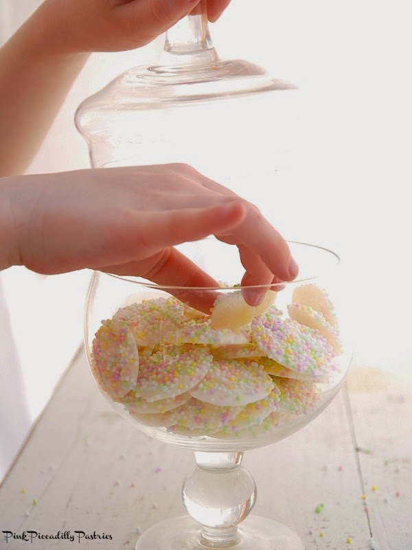 Immediately sprinkle the candy circles with pretty nonpareils.