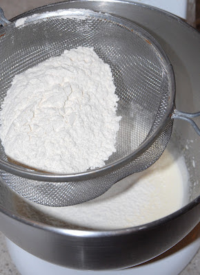 Next, bring your eggs to room temperature. (The quickest way to do this if they are in the fridge is to put them in a bowl, and cover them with hot water from the tap, and leave them for 10 minutes.) Sift together your flour and baking powder. Put your egg, egg yolk and cold water into a bowl with the sugar (recipe calls for caster sugar which is extra fine granulated sugar such as the Dixie Crystal brand.) Beat these ingredients with an electric beater for at least 5 minutes until they are pale yellow and fluffy. The mixture should fall in ribbons from the beaters and remain on the surface for a few seconds before sinking. (see above photo)