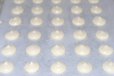 Then fill another piping bag with the meringue mixture and pipe circles onto your other parchment lined baking sheet (with the template underneath.)