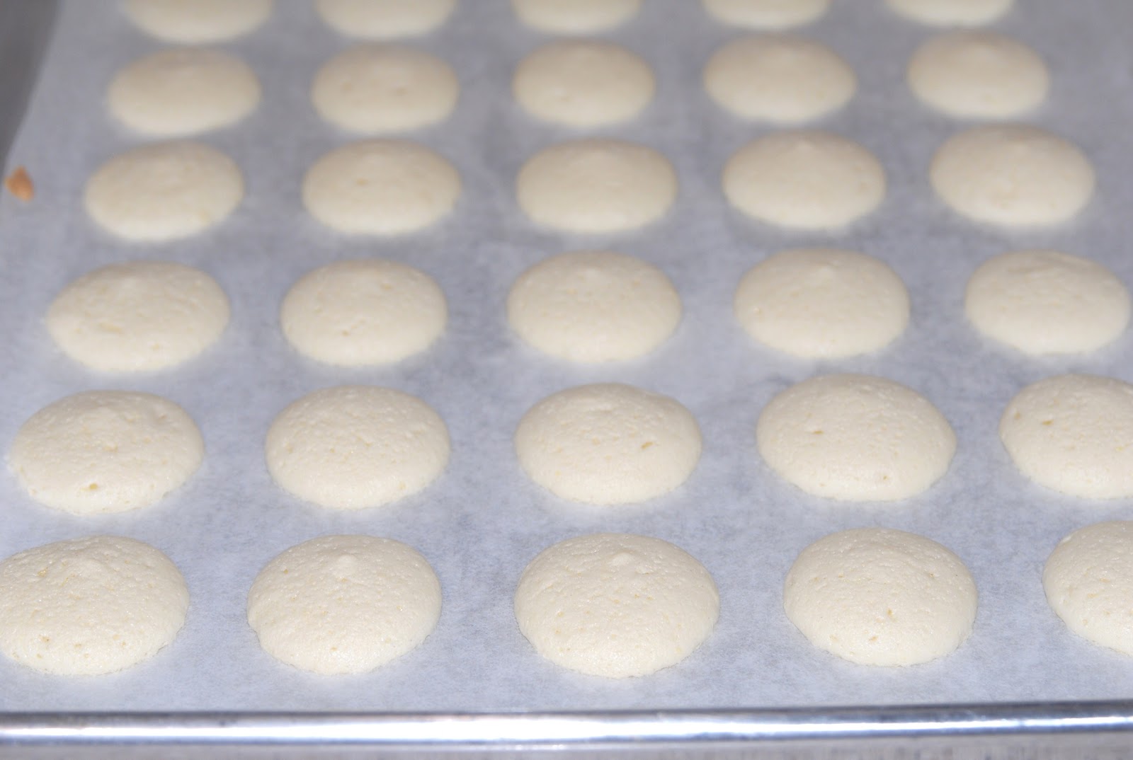 The next step is to drop the mixture in very small circular spoonfuls onto the prepared trays, trying to keep them all the same size. You could also use a piping bag with a plain circular tip, which is what I did. **A tip that I want to pass along to you is to use a template. Click this link for the template. I use this template for making french macarons and I found it extra handy for making this recipe as well! Just print it out on your printer and place it under your parchment paper. Then pipe your sponge batter onto the circles. You will use it for piping your meringue cookies on as well. That way, the top and bottom of your pastries will be about the same size. *Be sure to take out the template before baking.