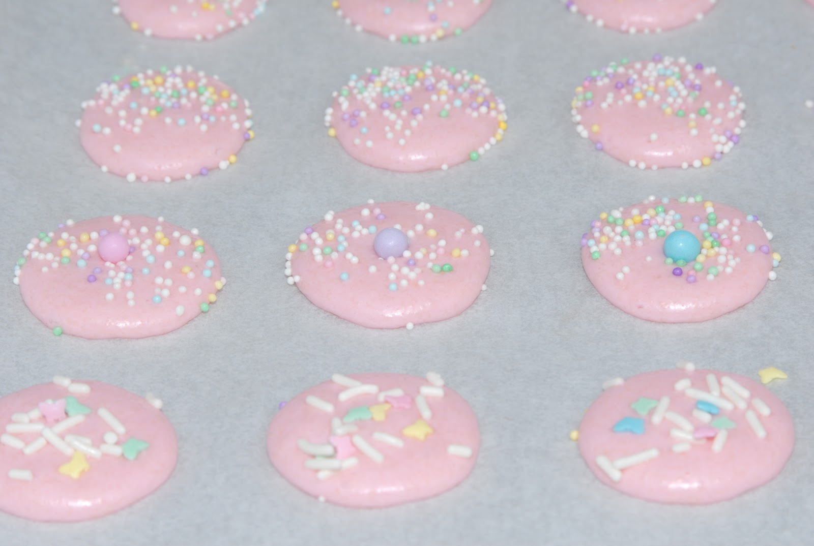 Here is what they look like before baking. You have to add your sprinkles right after they are piped, then let them sit out until they develop a “crust.” This is necessary if you want them to develop “feet.”