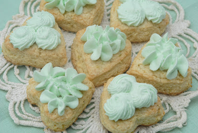 At this point, you can split your scones and spoon or pipe filling or top your scones with the filling using a pastry bag with an open star tip. I got 25 scones using my 2″ heart shaped cookie cutter.