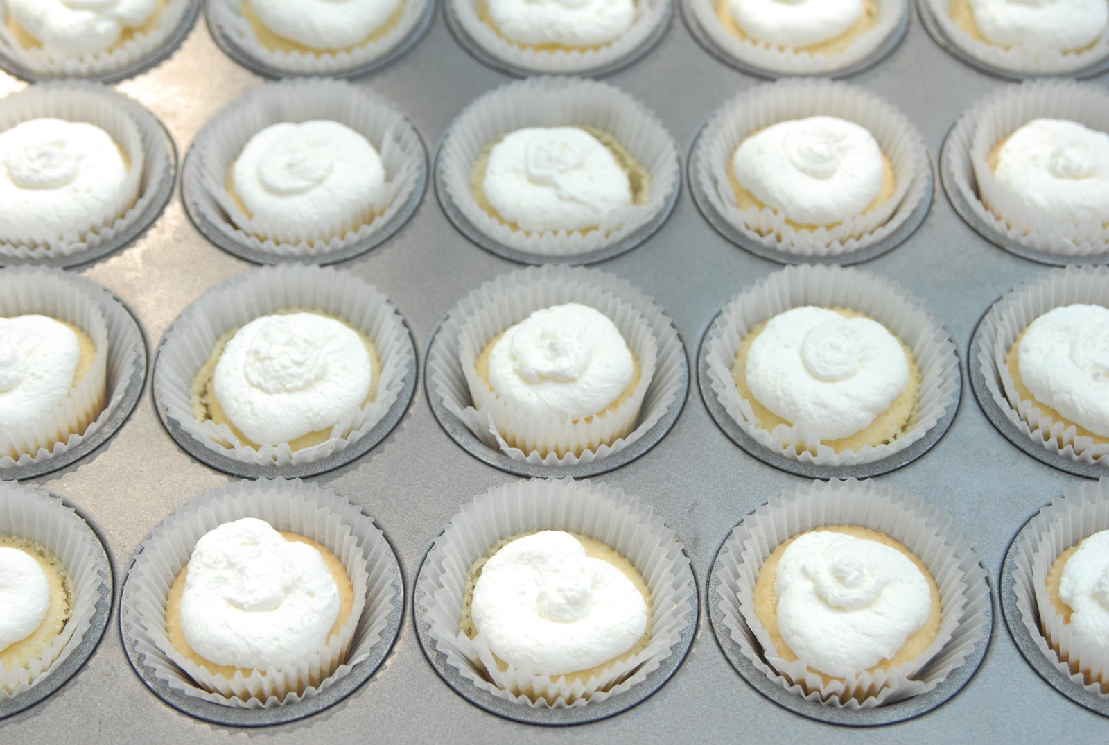 OK, you’ve got your cakes, meringues and coulis cooling (coulis cooling!), now you going to whip the cream! Using a chilled bowl with chilled beaters, beat one pint heavy cream and 1/3 cup powdered sugar until stiff peaks. Now we’re going to begin to put the pastries together. First, fill a piping bag with some of the cream (use any type of plain round tip) and pipe a circle of the whipped cream on top of the pound cakes. (photo above)
