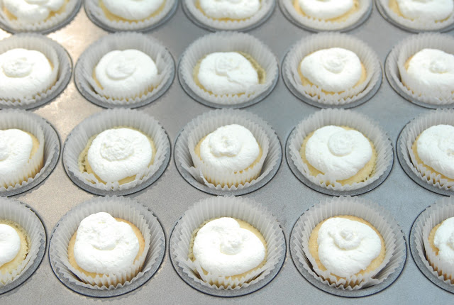 First I placed mini cupcake papers in 2 mini muffins pans. Next I went right by the directions for the pound cake mixture, then used my mini cookie scoop to drop the mixture into the papers. (fill about 2/3 full) Since the directions don’t come with baking time for mini cupcakes, I guessed at the time and 14 minutes was just right.