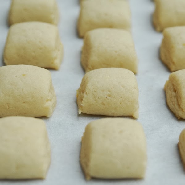 Remove dough from the refrigerator and divide into four equal parts. Shake each piece into a ball. Keep other balls of dough in fridge while you work with the first ball. Divide each ball into four smaller balls (about 2 inches each). Roll ball in palm to make an eight inch rope. (If it makes a six inch rope that’s fine – you’ll just cut 3 cookies instead of 4). With a knife, cut each rope into 2 inch pieces. Place 1 inch apart on baking sheet.