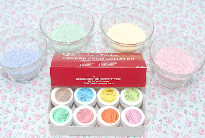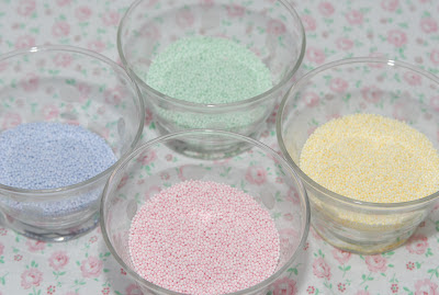 I made these sprinkles using a box of white non-pareils from here, and a powdered food coloring kit from here. All you have to do is stir the powdered food color into the white non-pareils until you get the color that you want!
